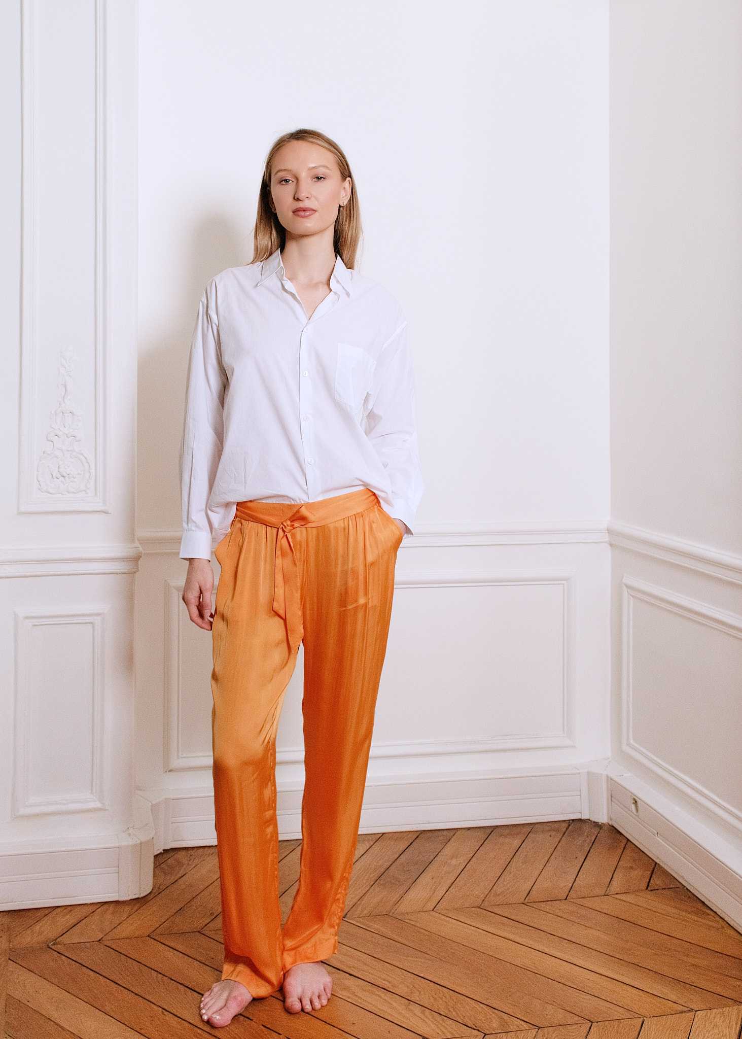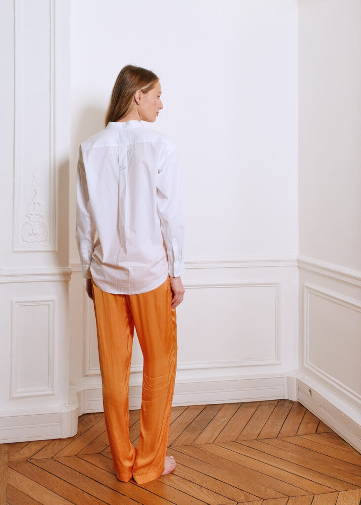 Disponible en deux couleurs, le pantalon Mary est un pantalon à coupe droite avec deux poches à l’italienne et une ceinture à nouer. En satin de viscose, il se distingue par son toucher très doux et frais comme de la soie, fluide et légèrement brillant sur l’endroit.