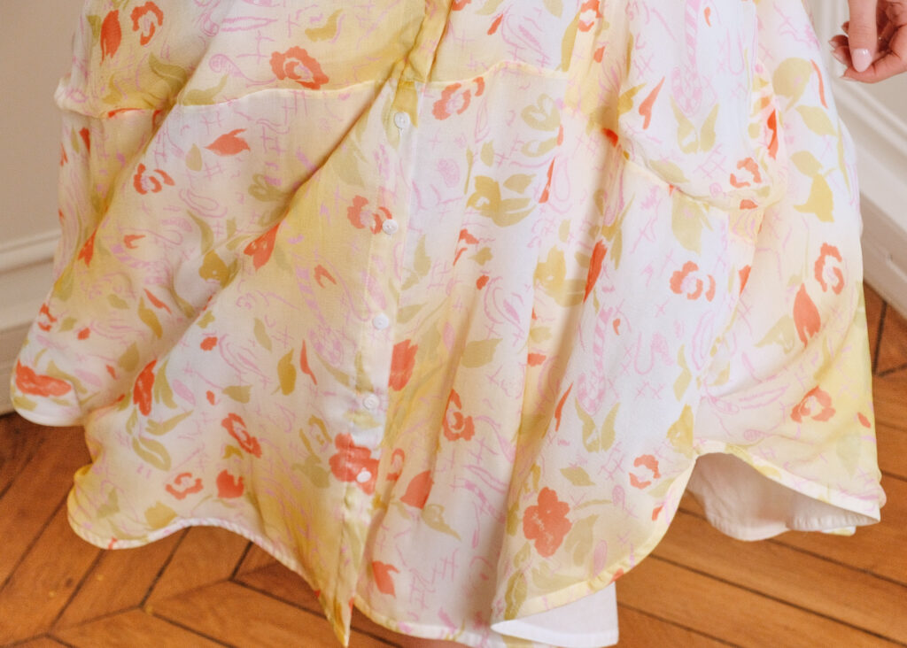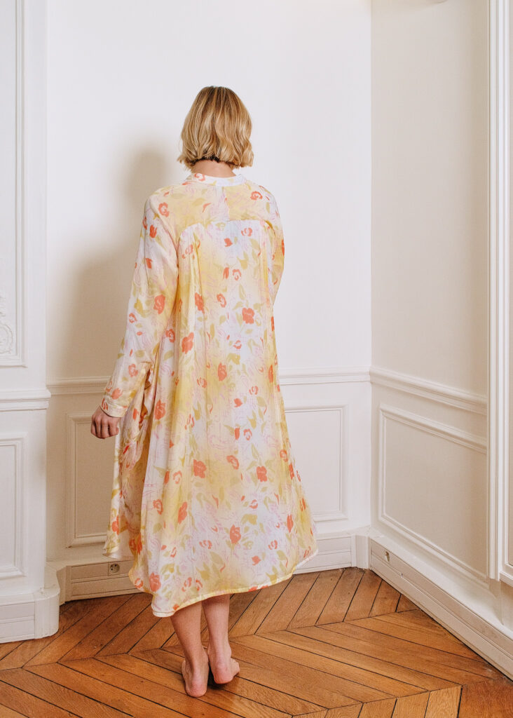 Une robe évasée à la construction moderne et géométrique qui permet une grande aisance de mouvement et dont le motif de fleurs abstrait sur une mousseline de viscose accentue la fluidité du modèle. Les graminées brodées donnent de la lumière au tissu.