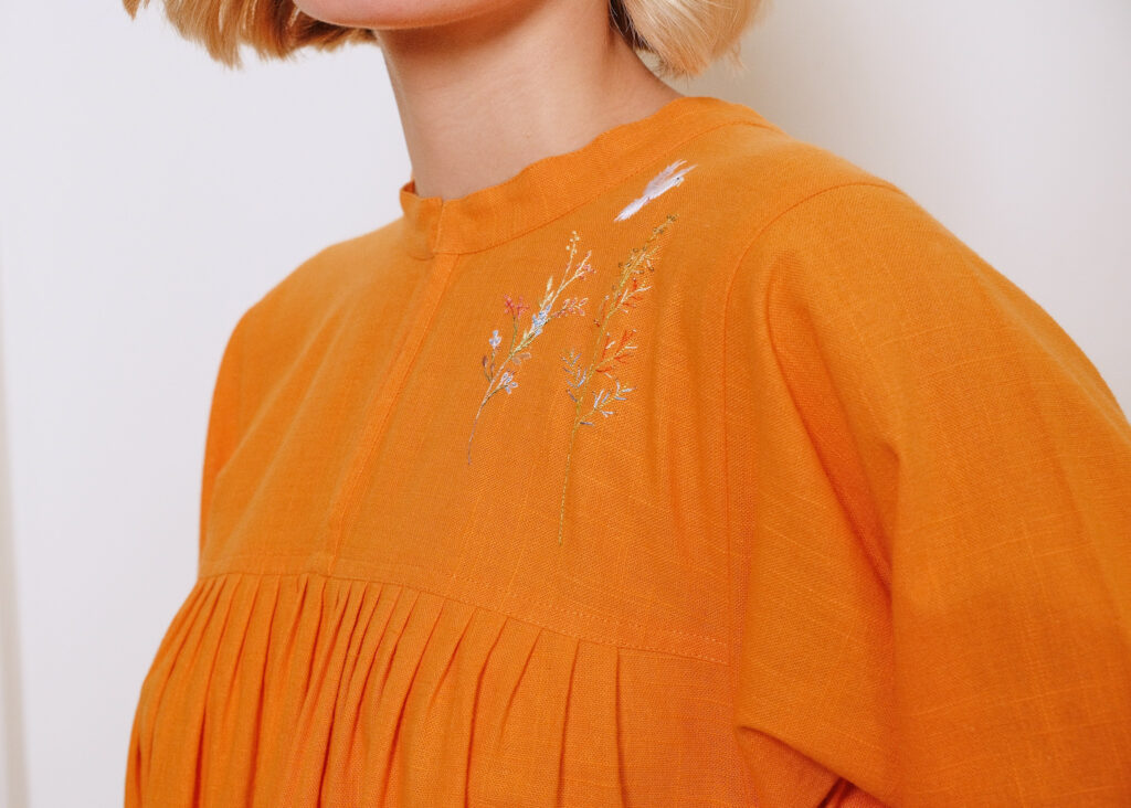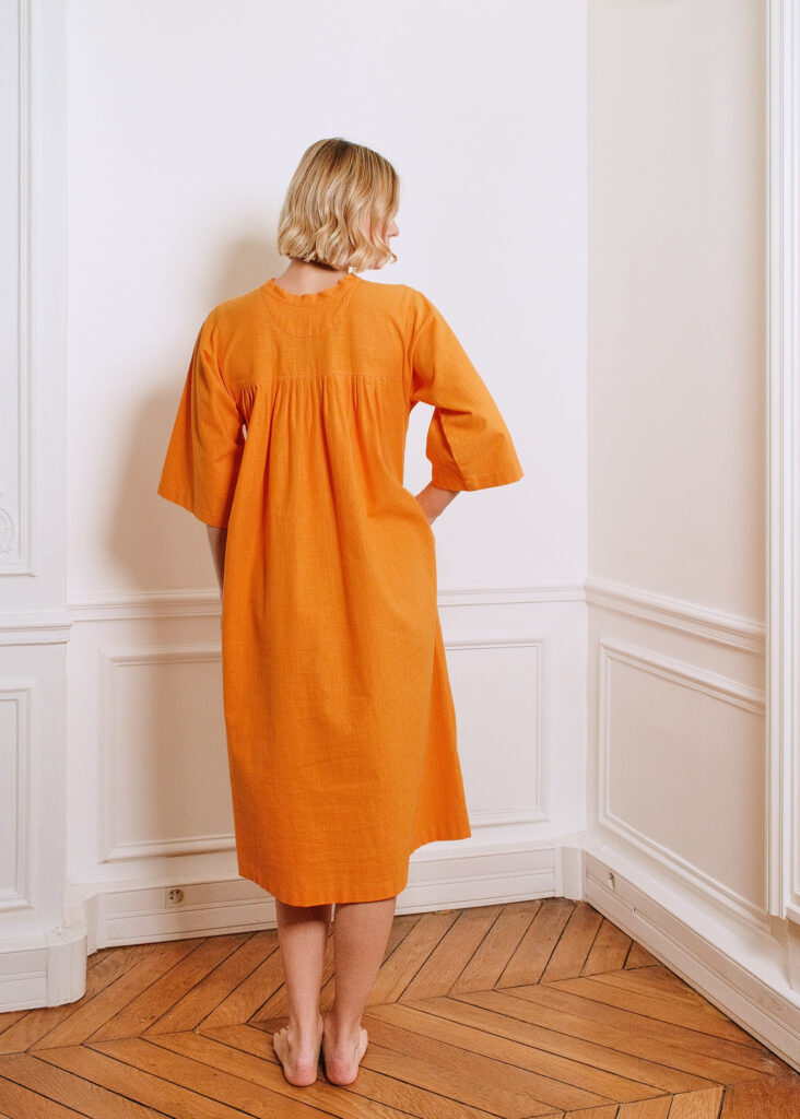 Cette robe évasée en khadi de coton orange vif, inspire toutes les postures et vous insuffle une énergie vitale. Les broderies de tiges et d’oiseaux sont d’une grande délicatesse.