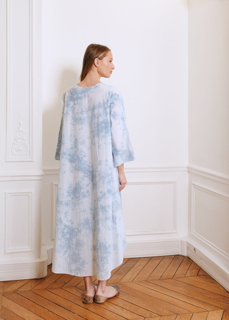 Une robe ample et confortable à la couleur d’un ciel nuagé, obtenue par la technique traditionnelle du tie & dye et délicatement brodée de graminées sauvages.