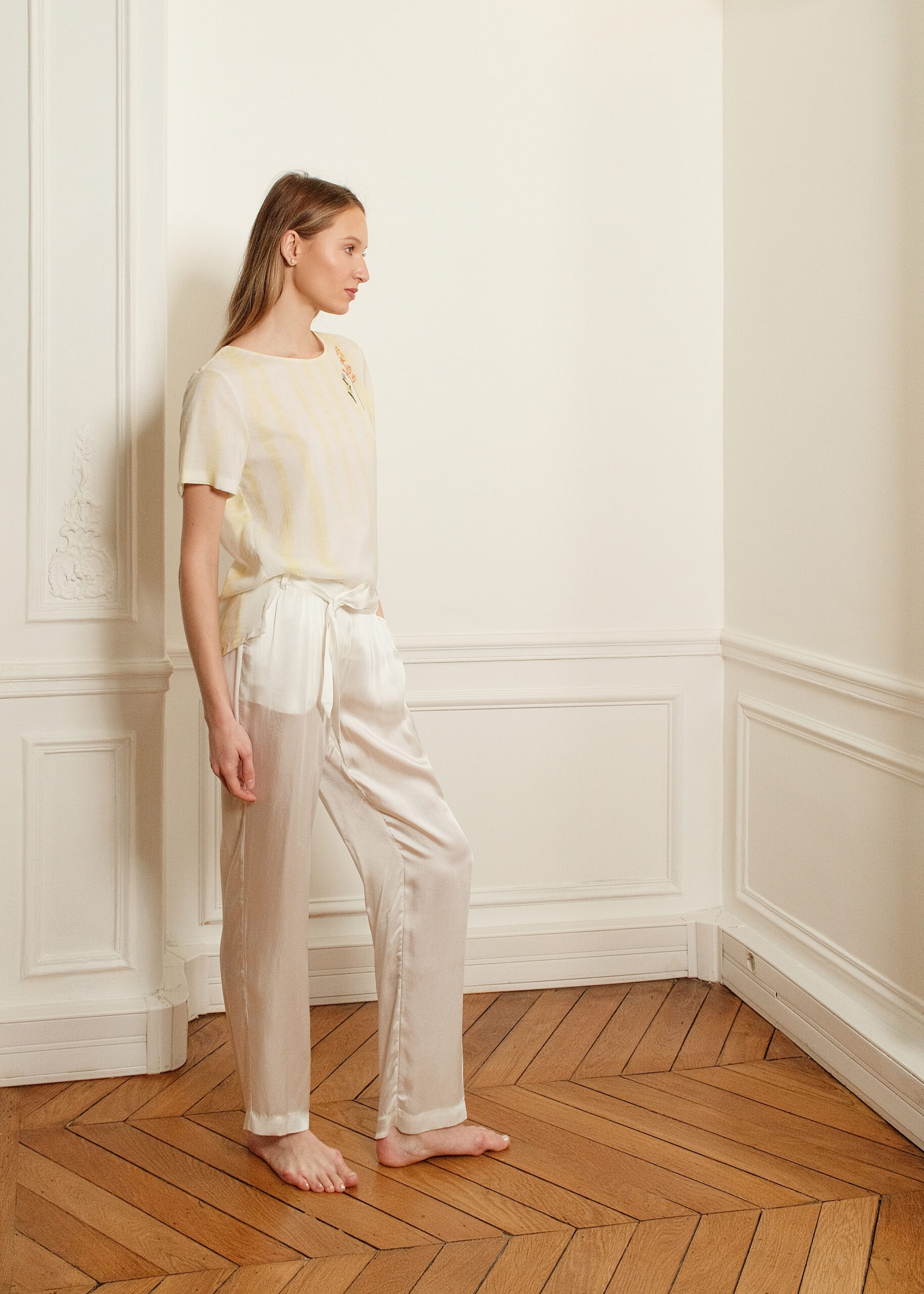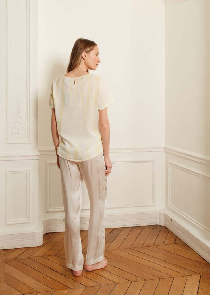 Disponible en deux couleurs, le pantalon Mary est un pantalon à coupe droite avec deux poches à l’italienne et une ceinture à nouer. En satin de viscose, il se distingue par son toucher très doux et frais comme de la soie, fluide et légèrement brillant sur l’endroit.