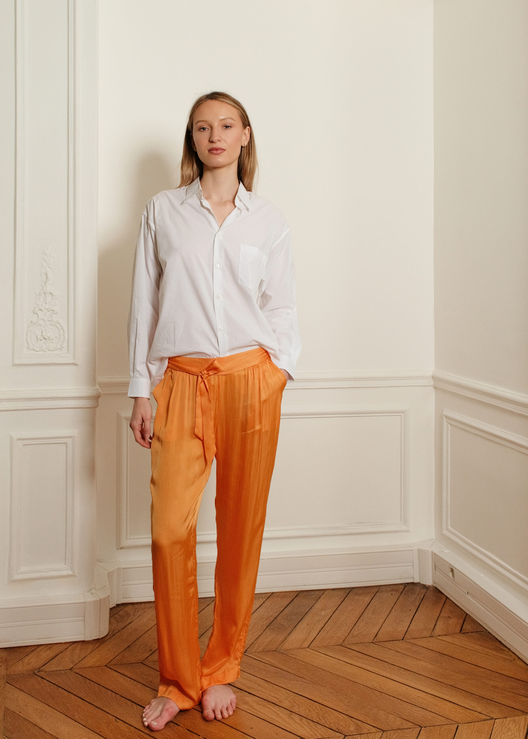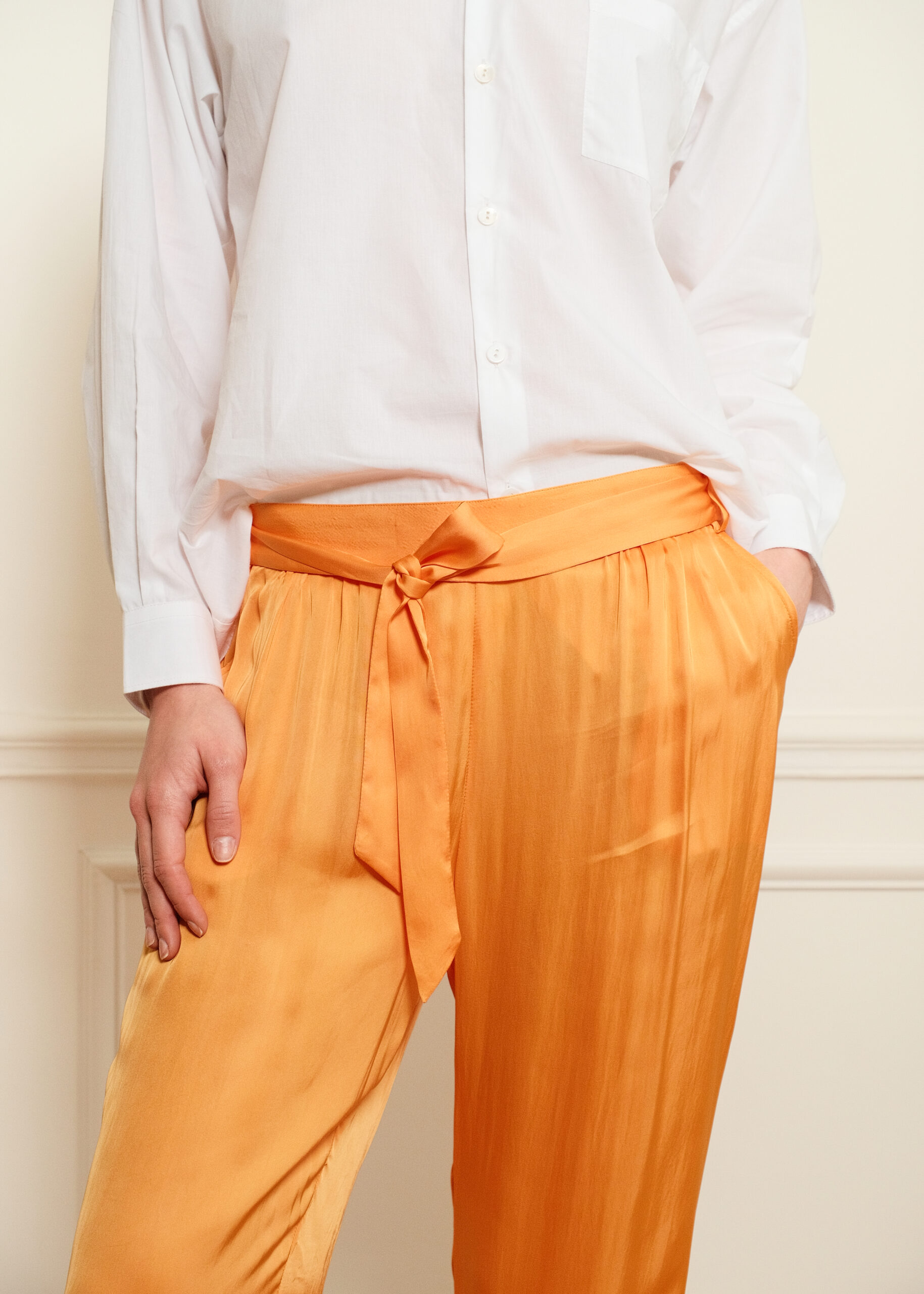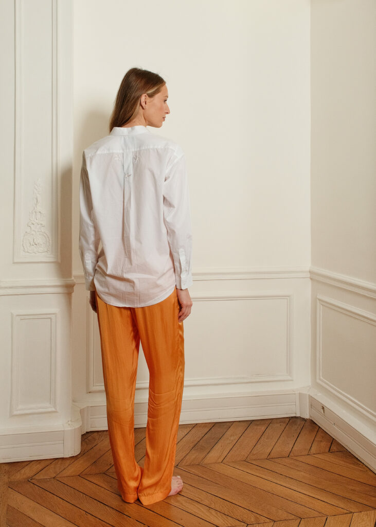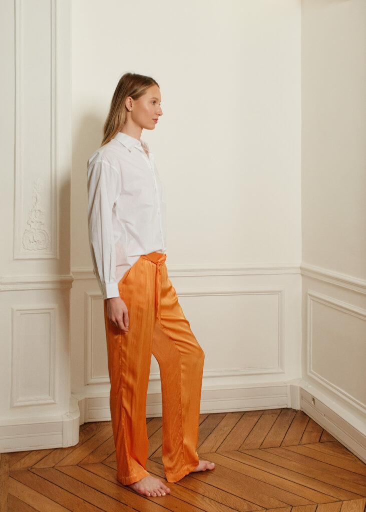 Disponible en deux couleurs, le pantalon Mary est un pantalon à coupe droite avec deux poches à l’italienne et une ceinture à nouer. En satin de viscose, il se distingue par son toucher très doux et frais comme de la soie, fluide et légèrement brillant sur l’endroit.