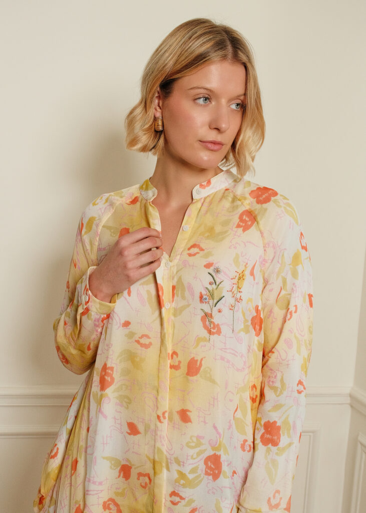 Une robe évasée à la construction moderne et géométrique qui permet une grande aisance de mouvement et dont le motif de fleurs abstrait sur une mousseline de viscose accentue la fluidité du modèle. Les graminées brodées donnent de la lumière au tissu.