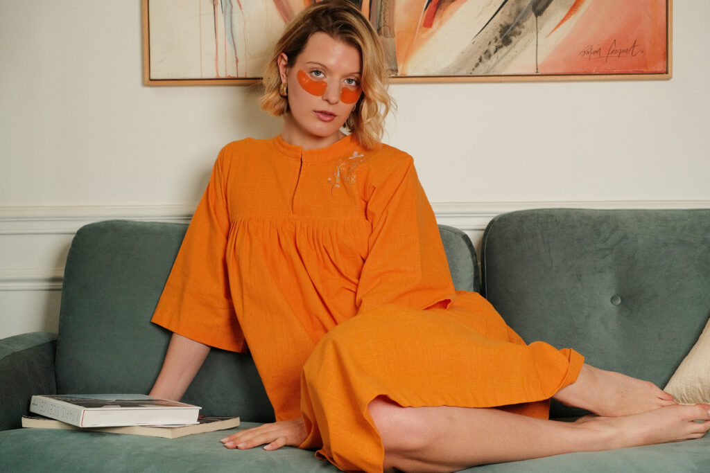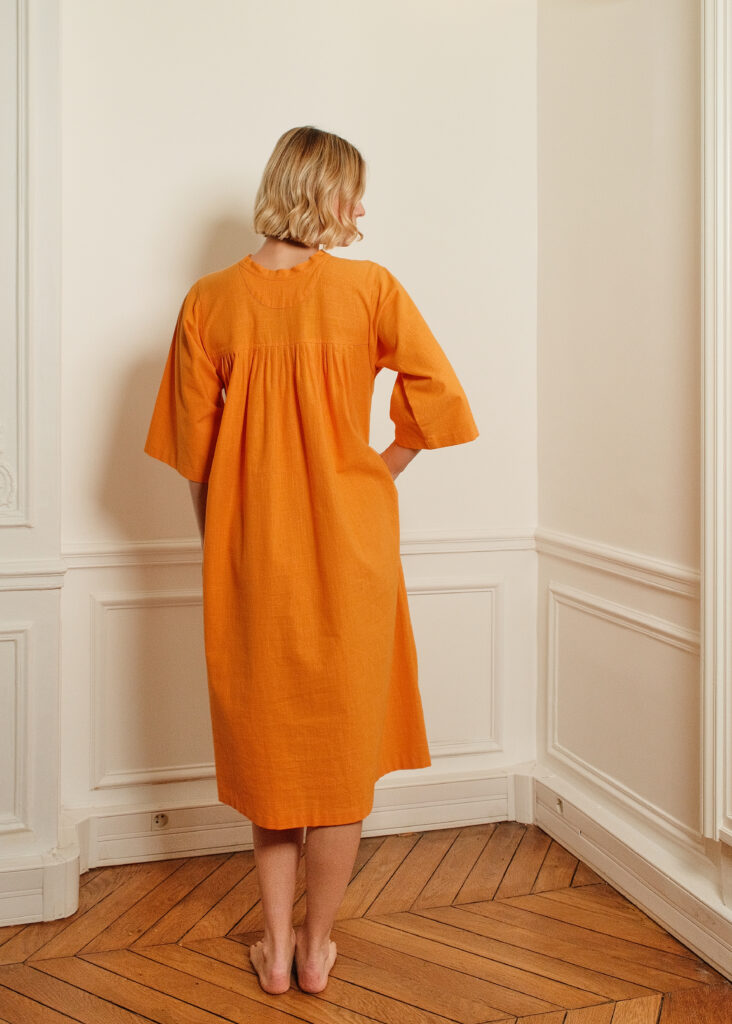 Cette robe évasée en khadi de coton orange vif, inspire toutes les postures et vous insuffle une énergie vitale. Les broderies de tiges et d’oiseaux sont d’une grande délicatesse.
