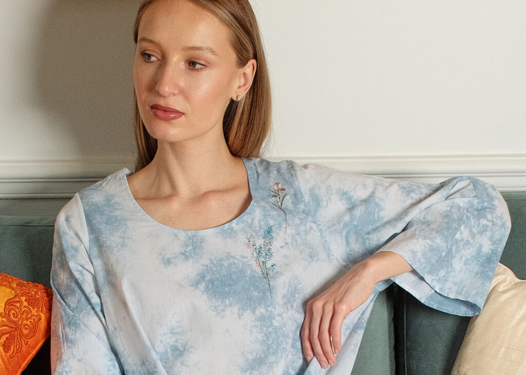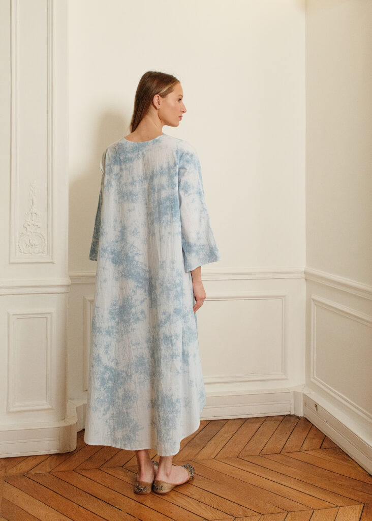 Une robe ample et confortable à la couleur d’un ciel nuagé, obtenue par la technique traditionnelle du tie & dye et délicatement brodée de graminées sauvages.