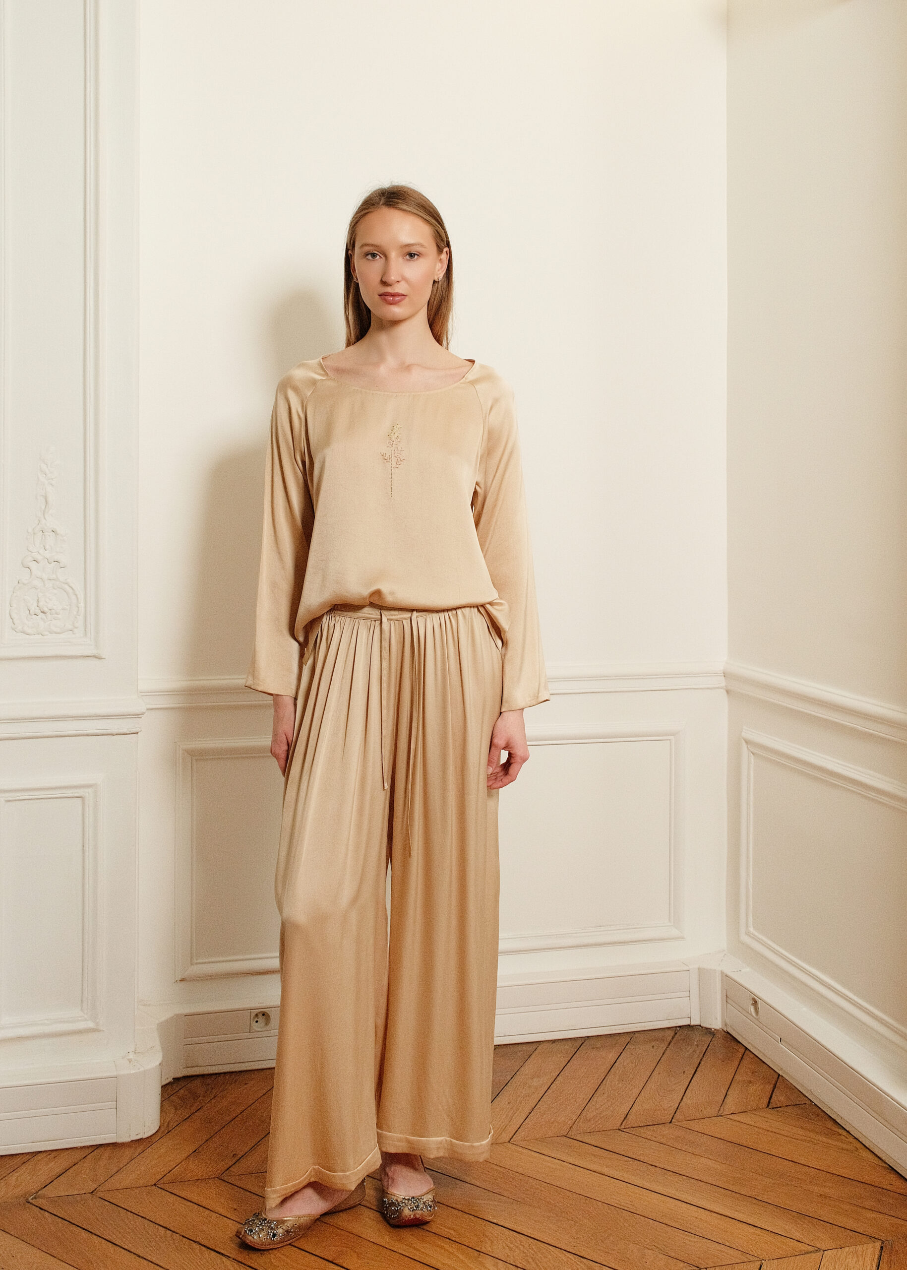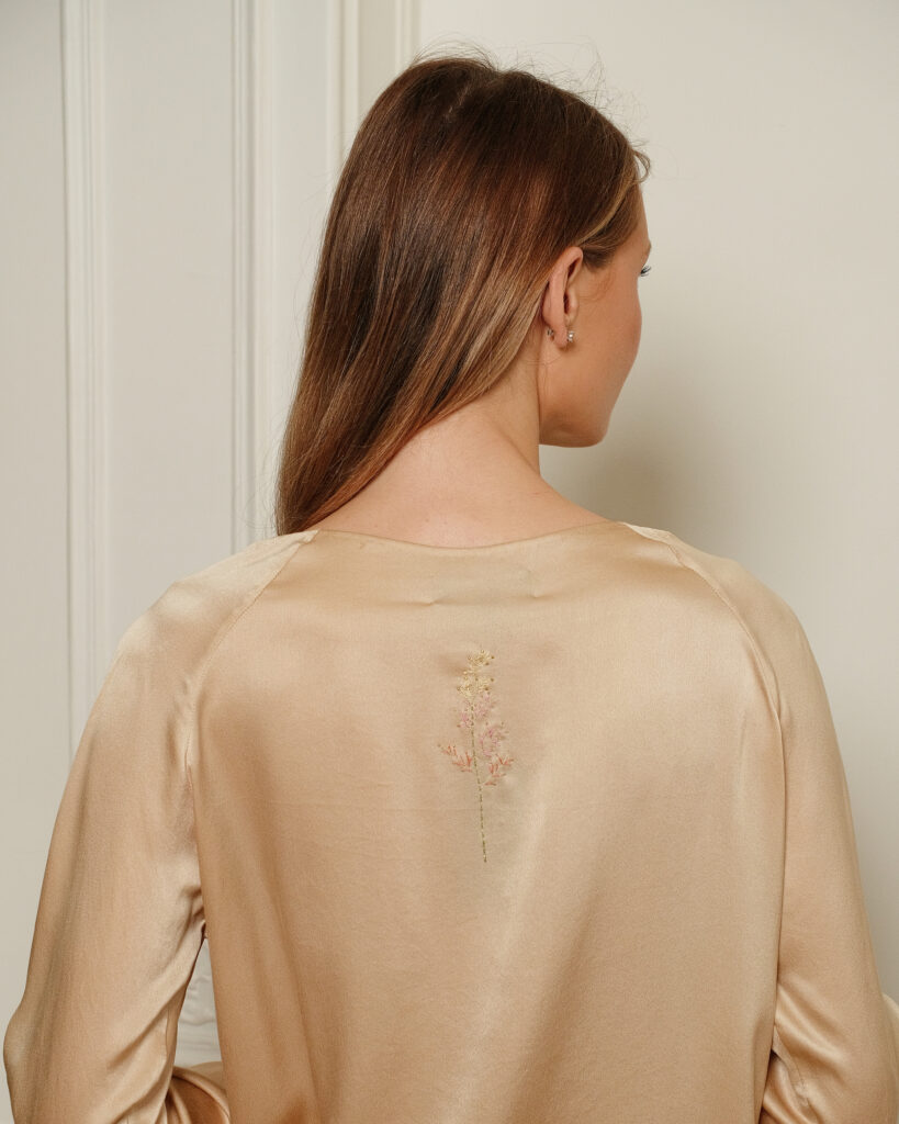 Un ensemble moderne et féminin en soie lavée, très doux sur la peau. Nous l’avons sophistiqué en y brodant quelques tiges florales légères, sous l’encolure et dans le dos.